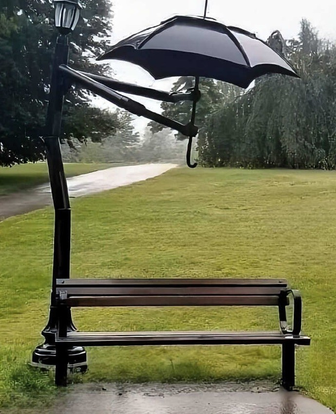 Элегантное решение вечной проблемы: хочется посидеть на свежем воздухе, но солнце или дождь мешают. Встроенный зонт превращает обычную скамейку в мини-оазис комфорта в любую погоду. Когда дизайнер думает на два шага вперед и предугадывает потребности людей — получается идеальная городская мебель.