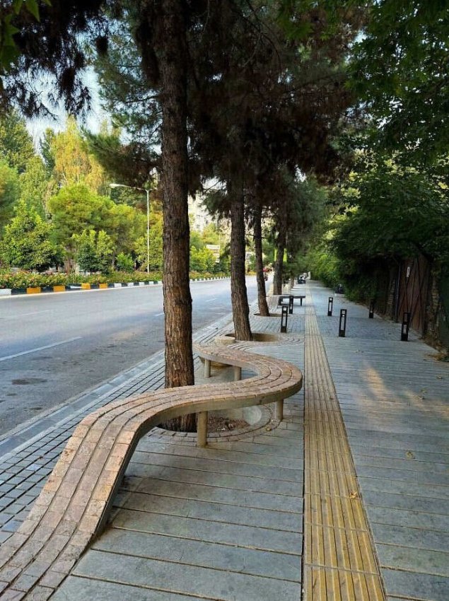 Кирпичная мостовая на тротуаре, которая превращается в общественную скамейку в Ширазе, Иран