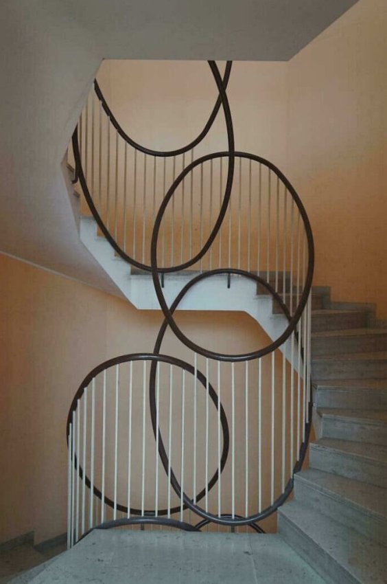 Обычные перила превратились в абстрактную скульптуру благодаря смелому решению дизайнера. Переплетающиеся круги не только безопасны и функциональны, но и создают гипнотический визуальный эффект. Каждый подъем по лестнице становится маленьким путешествием через современное искусство.