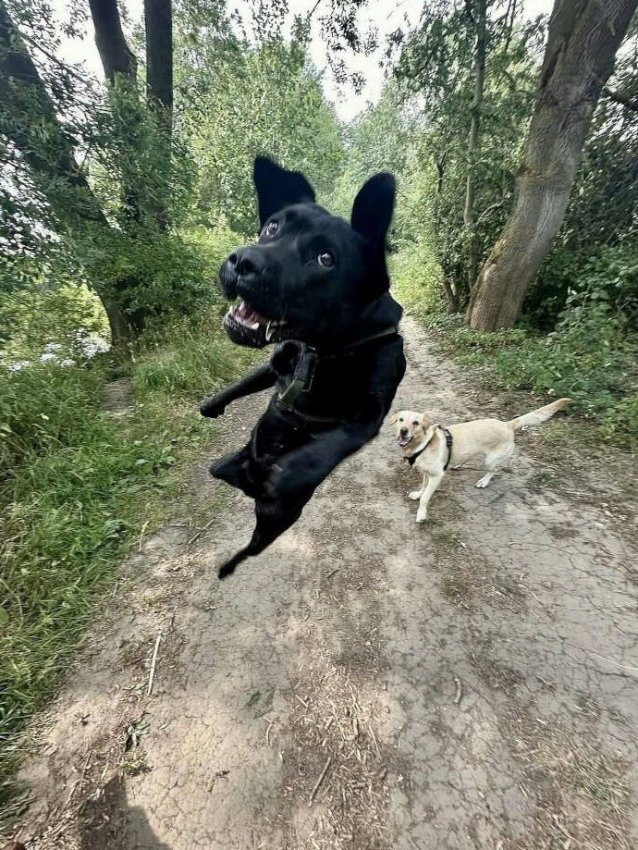 План был простой: спокойная прогулка в парке. Но Рекс решил, что это идеальный момент для атаки в стиле хоррор-фильма категории 18+. Золотистый ретривер сзади уже мысленно пишет заявление в полицию на своего психованного друга.