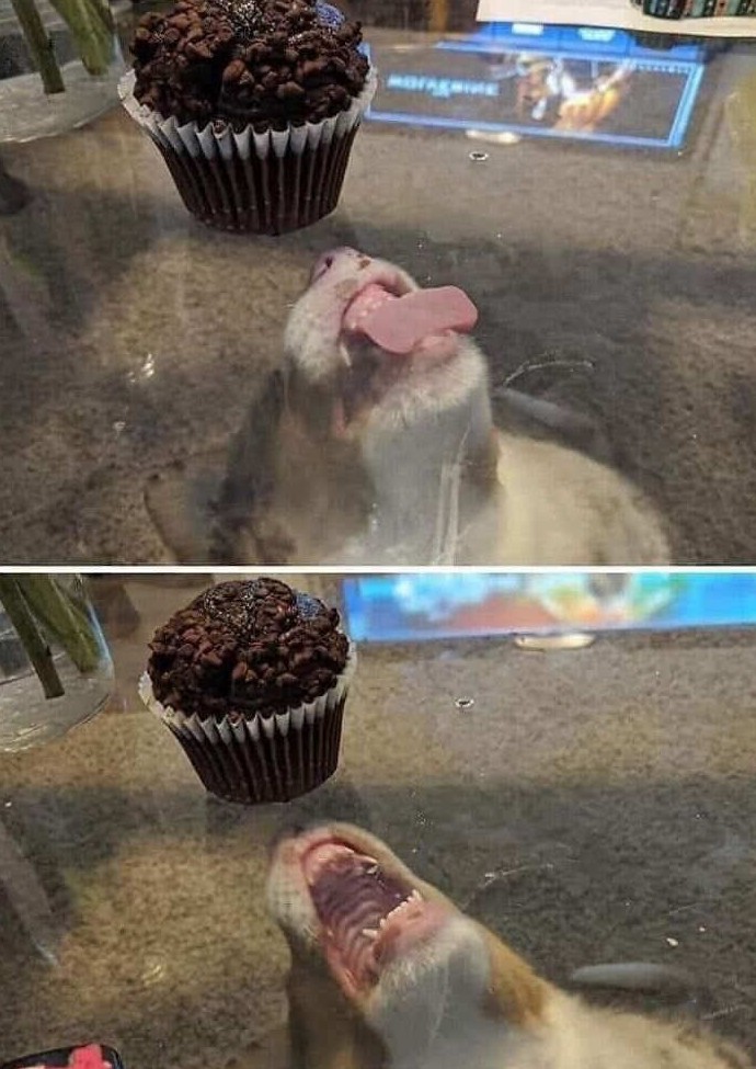 Когда ты наконец понял, что кекс не просто еда, а смысл всего твоего существования. Хомяк попытался поглотить десерт целиком вместе с мультивселенной, но где-то на полпути его челюсть зависла в режиме «загрузка». Врачи говорят, что рот закроется сам… когда-нибудь.