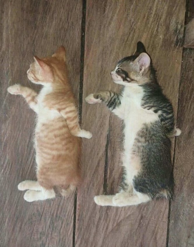 Два котенка освоили универсальный жест «Мы сдаемся!» в идеальной синхронности. Возможно, их поймали на краже корма, или они просто молятся богу тунца о дополнительном ужине. В любом случае, эта парочка знает, что милота — лучшее оружие, и активно им пользуется. Ставка на умиление — беспроигрышная стратегия в мире котят.