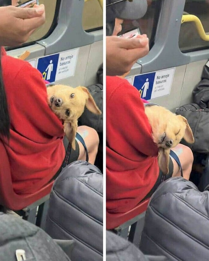 Эта маленькая собачка освоила искусство путешествия в общественном транспорте и теперь оценивающе смотрит на попутчиков. В первом кадре — любопытство и надежда на новое знакомство, во втором — разочарование и философское принятие того факта, что не все люди готовы к общению. Видимо, кто-то не ответил на приветственный взгляд, и теперь этот пассажир обдумывает смысл жизни.
