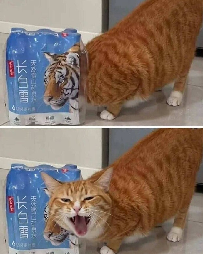 Рыжий кот обнаружил упаковку, на которой красуется фотомодель-тигр, и его реакция — это чистое негодование. «Обещали тигра, а прислали воду!» — именно это написано на его морде. Маркетологи явно перестарались с фотошопом, и теперь этот разгневанный клиент требует объяснений. Потребительские права котов — это не шутка!