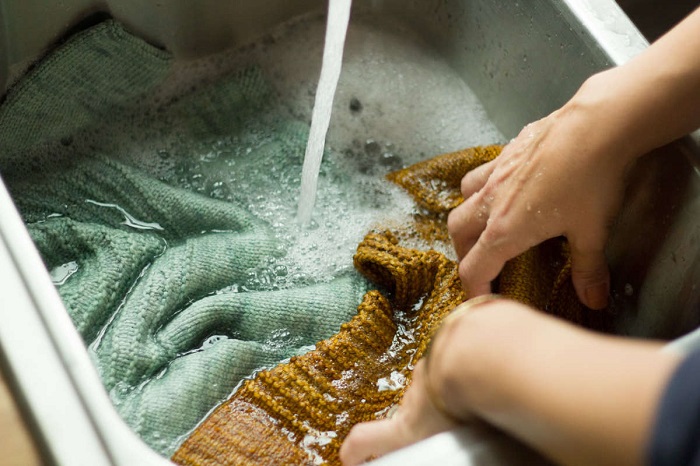 Шерстяной свитер желательно стирать только руками. / Фото: cleanadvice.ruКонечно, в современных стиральных машинках есть режимы ручной или деликатной стирки, которым можно воспользоваться, либо просто установить температуру не более 40С, количество оборотов – до 400 и дополнительное полоскание. Однако лучше все-таки стирать шерстяные вещи руками, чтобы они точно не полиняли и не растянулись. Для этого налейте в тазик холодную воду, добавьте необходимое количество средства для стирки шерстяных тканей, вспеньте воду, положите туда свитер и оставьте его на 30-40 минут. По истечению времени, вытащите из тазика вещи и сполосните ее в холодной воду. Обратите внимание на то, что горячую использовать нельзя, так как при резкой смене температуры изделие потеряет эластичность и деформируется.Если под рукой не оказалось специального средства для стирки шерстяной одежды, можете пойти другим путем и использовать детский или собственный шампунь (предпочтительнее первый вариант, так как в его составе нет вредных химических компонентов).Чтобы после стирки свитер не утратил свою мягкость и не стал жестким, прополоскайте его в воде с добавлением кондиционера для белья. Однако не переборщите, так как чрезмерное количество средства приводит к тому, что вещь становится липкой и неприятной на ощупь.Обратите внимание: Устранить запах пота и восстановить упругость волокна поможет следующий лайфхак – повесьте свитер в ванной комнате, наполненной паром, на несколько часов, а затем высушите на открытом воздухе.