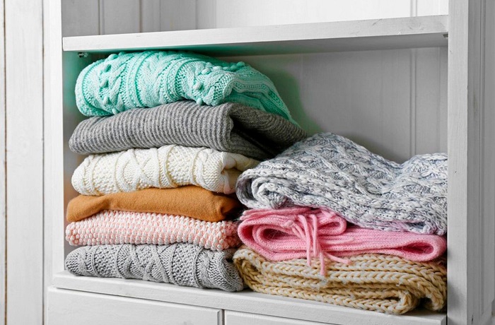 Свитера нужно складывать аккуратными стопками. / Фото: odezhda.guruСвитера из тяжелой плотной шерсти имеют свойство быстро растягиваться. В этом им «помогает» неправильное хранение. Подобную одежду нельзя вешать на плечики, так как под своей тяжестью она вытягивается и теряет форму. Лучше всего сложить вещи аккуратными стопками и убрать в ящик комода либо на полку шкафа.