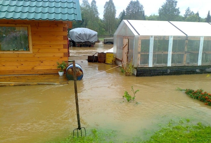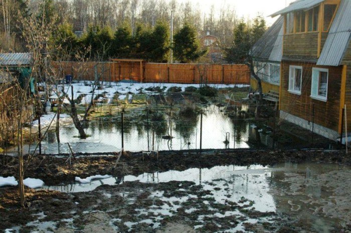 Вода на участке - это беда. |Фото: banya-expert.com.Ситуация в целом простая и понятная. Сосед на нижнем участке страдает от того, что во время дождей (а также по весне) его дачу заливает с верхнего участка. Вследствие этого на нижнем участке принимаются меры по недопущению воды, создается отсыпь или вовсе устанавливается бетонная лента под забором. Вторая из упомянутых мер является крайне эффективной, однако имеет одно неприятное последствие уже для верхнего соседа – вода может начать скапливаться на его даче, так как ей будет некуда идти.
