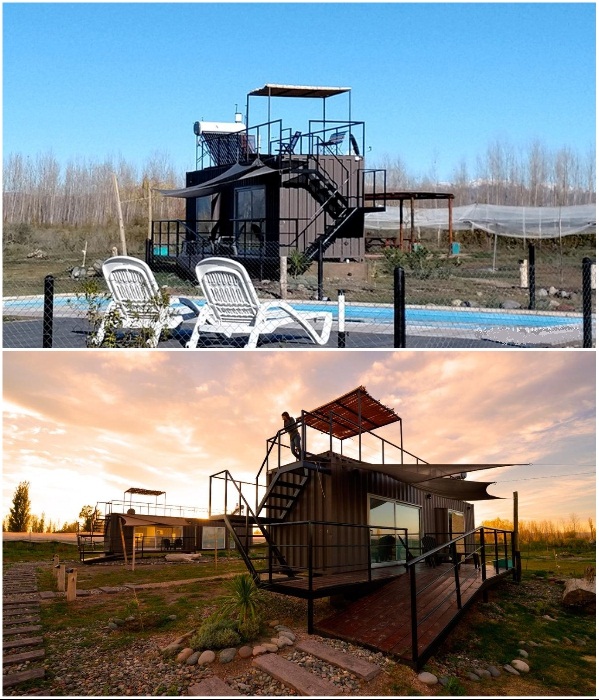 Аргентинская семья решила открыть гостиничный бизнес, но не обычный. В качестве номеров они собственноручно оборудовали небольшие гостевые домики из морских контейнеров в лучших традициях эко-дизайна. Теперь любители приключений и отдыха на природе могут наслаждаться чистым воздухом, тишиной, а если сильно захочется экстрима, то можно испытать себя на прочность, сплавляясь на плотах по реке Атуэль или отправиться на прогулку на лошадях. Эко-гостиницу «CasArtero Eco Posada» из морских контейнеров построили в живописной горной местности неподалеку от Сан-Рафаэль (Аргентина). | Фото: containerhacker.com.Одной аргентинской семье идея создания собственного эко-отеля пришла в голову уже давно, но их никак не устраивал тот факт, что при традиционном строительстве страдает окружающая среда и ландшафт природной зоны. Чтобы уменьшить негативное влияние на природу, номера гостиницы сделали из морских контейнеров («CasArtero Eco Posada», Аргентина). | Фото: booking.com.Просмотрев огромное количество вариантов, они решили остановиться на создании номеров из морских контейнеров, ведь учитывая климат и рельеф местности, их можно было устанавливать без фундаментов. А это существенно сокращает негативное влияние на экологию. Помимо того, что работа с контейнерами была проведена еще до установки их в заповедной зоне, так и все отделочные материалы использовались только экологически чистые и натуральные. Вся внутренняя отделка, мебель и даже светильники сделаны из экологически чистых материалов («CasArtero Eco Posada», Сан-Рафаэль). | Фото: glampinghub.com/ booking.com.Владельцы настолько бережно относятся к окружающему их гостевой дом пространству, что при обустройстве интерьеров внедряли только инновационные строительные технологии и обслуживающие системы. Причем покупка мебели, бытовой техники и даже обычных светильников основывались лишь на экологичных нормах. В каждом контейнерном номере организованы спальные места для 4 посетителей («CasArtero Eco Posada», Аргентина). | Фото: containerhacker.com.Несмотря на индустриальный экстерьер номеров, их внутреннее пространство довольно уютное и комфортное. Полностью обустроенный контейнерный домик без проблем может принять до 4-х гостей. Для посетителей эко-гостиницы созданы все необходимые условия для комфортного отдыха («CasArtero Eco Posada», Сан-Рафаэль). | Фото: containerhacker.com/ glampinghub.com.Для их комфортного отдыха созданы гостиная, полностью оборудованная кухня, полноценная ванная комната с душем и горячей водой, а также спальные места. Для того чтобы гости могли наслаждаться прекрасным пейзажем и чистейшим горным воздухом, оформили две террасы, одну – сразу у входа, а вторую – на крыше домика. На территории гостевого дома создали бассейн с лаунж-зоной («CasArtero Eco Posada», Сан-Рафаэль). | Фото: glampinghub.com/ booking.com.Так же к услугам посетителей небольшой бассейн с лаунж-зоной где на шезлонгах можно принимать воздушные или солнечные ванны. Для гостей организовали зону барбекю и ресторан, причем завтрак и обед входит в стоимость пребывания («CasArtero Eco Posada», Сан-Рафаэль). | Фото: containerhacker.com.По сведениям авторов Novate.Ru, чтобы обеспечить наполнение бассейна и удовлетворить потребности посетителей, были установлены ультрасовременные системы сбора и полной переработки использованной воды. Не обошлось без внедрения возобновляемых источников энергии и контроля над теплоэффективностью и п