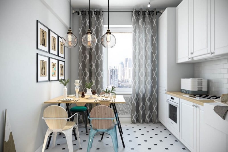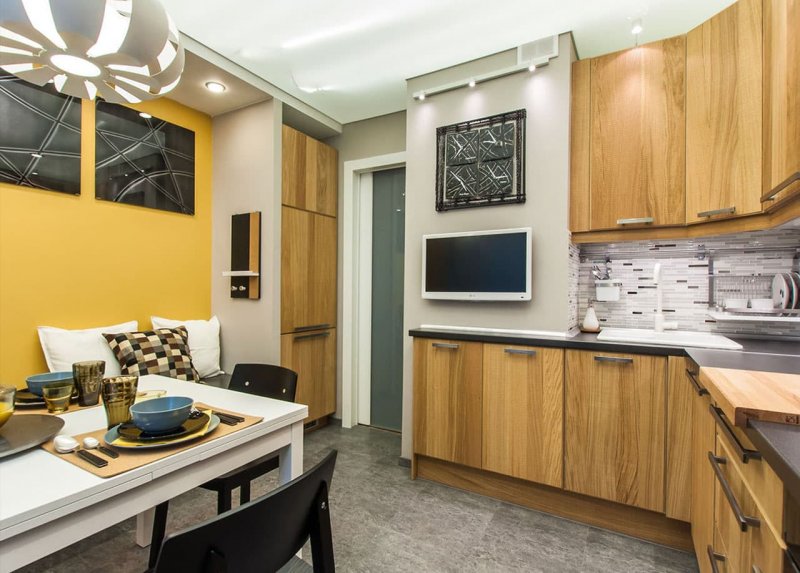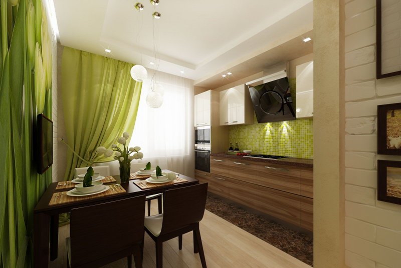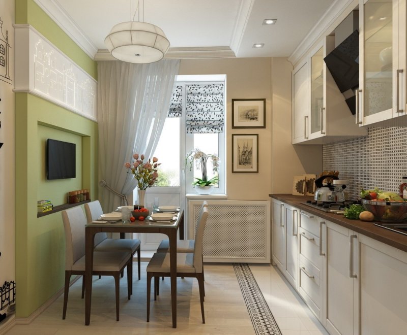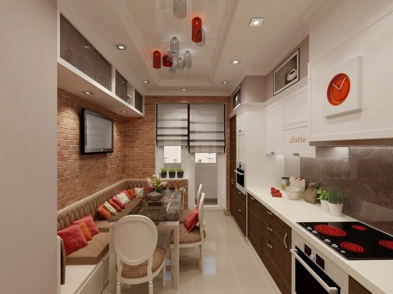 Современная кухня может иметь любую планировку. Если из комнаты есть выход на закрытую лоджию или балкон, там можно оборудовать обеденную зону. Дверь убирают вовсе или завешивают проем незаметными однотонными шторами, легким тюлем, подходящим под интерьер.