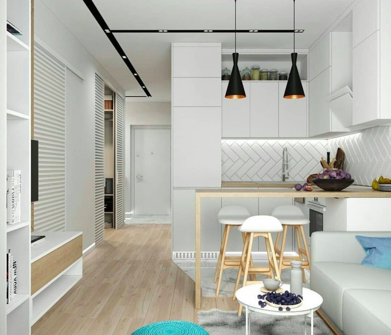Если же акцент делается на комфортное времяпровождение, то кухонная зона оборудуется по минимуму. Выбирается компактная мебель, встраиваемая бытовая техника, уменьшается рабочая поверхность. При этом пространство лучше оставить целостным, отказаться от использования некоторых способов зонирования, например, организации подиума, установки перегородок, барной стойки, прочего.