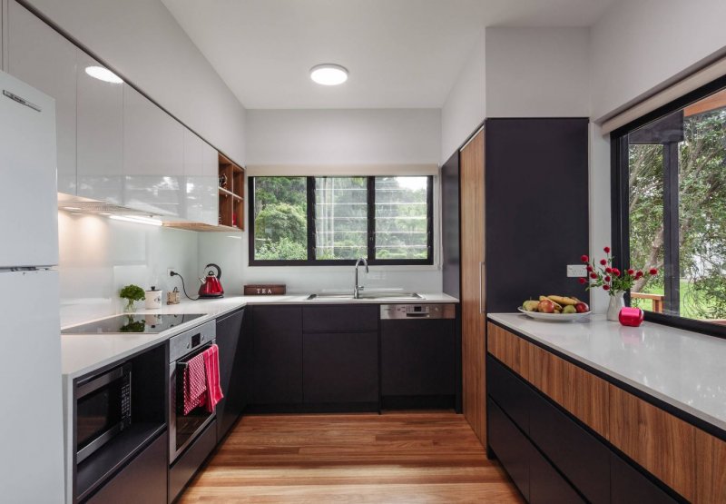 Кухонный гарнитур и бытовую технику можно расположить как у глухой перегородки, так и у стены с оконным проемом. Во втором случае необходимо соблюдать технику безопасности. Окно нельзя закрывать занавесками, которые ветром может задуть на огонь и произойдет возгорание. Вдоль проема лучше установить рабочую поверхность, а раковину и плиту разнести в разные стороны.