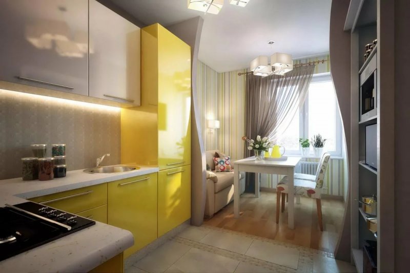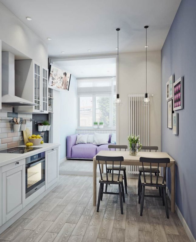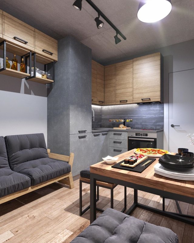 В этом случае рекомендуется максимально использовать потенциал стен. Вешать на них полки, навесные шкафы, достигающие потолка. Для разделения функциональных зон используется обеденный стол, под которым дополнительно можно организовать подиум. Также в качестве зонирования можно применять осветительные приборы, выбрать разные по цвету или составу отделочные материалы.