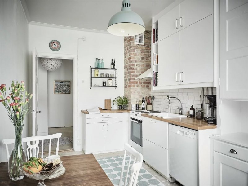 Стильным акцентом в провансе будет оригинальная вытяжка, замаскированная под выход печной трубы. Для отделки поверхностей используют натуральное дерево, глину, мел, штукатурку. Скатерти и обои однотонные или в мелкий цветочный рисунок.
