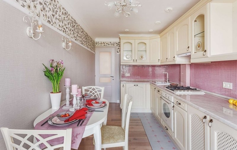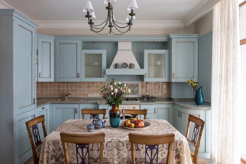 В интерьере такой кухни уместны любые деревенские мотивы. Настоящее очарование и романтизм передадут пастельные тона в отделке, винтажная мебель, эмалированная посуда на открытых полках и нежные занавески вместо дверок гарнитура.