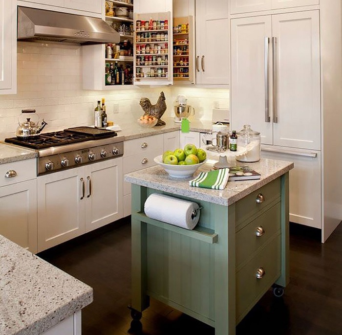 Узкий проход между столешницей и кухонным островом. / Фото: mzalex.ruЕсли на вашей кухне расположен остров, помните, что между ним и гарнитуром должен быть свободный проход около 100-120 сантиметров. Такое расстояние позволяет без проблем передвигаться по комнате, не цепляясь за углы, и не сталкиваясь с бегущими навстречу домочадцами. Также старайтесь не ставить обеденный стол слишком близко к выходу, чтобы было удобно открывать/закрывать двери на кухню (если они распахиваются вовнутрь).Помните: Вся мебель должна располагаться на имеющейся площади таким образом, чтобы никто не спотыкался и ничего не мешало свободному передвижению. Поэтому позаботьтесь о наличии широких проходов.