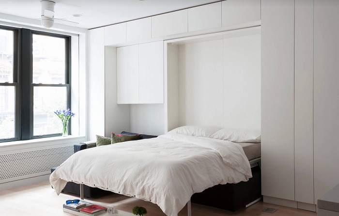 2в1: Кровать и шкаф. / Фото: dekormyhome.ruЧтобы сэкономить ценные квадратные метры, выбирайте для обустройства квартиры многофункциональную или компактную мебель. Например, если у вас однокомнатная квартира, то можно поставить шкаф, в котором «прячется» кровать. Так, вы ночью сможете спать на полноценной постели, а днем площадь квартиры увеличится, ведь лишняя мебель не станет путаться под ногами. При обустройстве кухни обратите внимание на складные столы и стулья, которые занимают минимум места. Однако, такой вариант подойдет лишь в том случае, если в квартире живет не более двух человек.Обратите внимание: Если в семье есть дети, обратите внимание на комбинацию стола, шкафа и кровати на втором этаже. Это прекрасный вариант для детской – есть, куда складывать вещи, где делать уроки, и на чем спать. А процесс залезания каждый вечер на второй этаж вызовет у ребенка настоящий восторг.