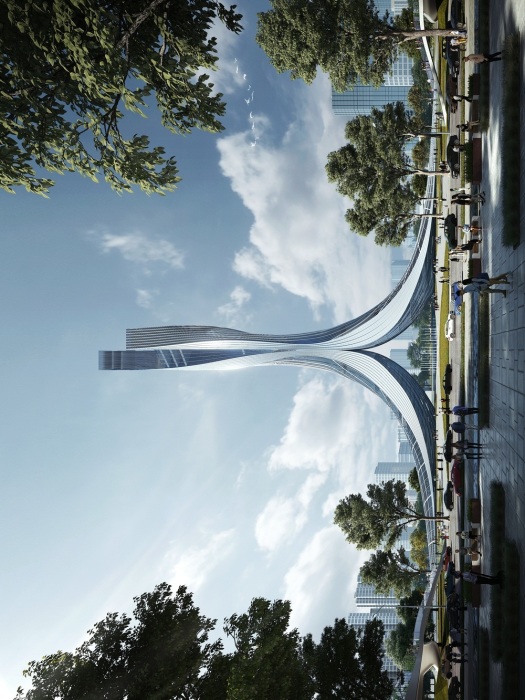 Если повернуть переплетенные небоскребы на 90 градусов, то они будут похожи на летящего гуся (концепт RMJM Shanghai). | Фото: archdaily.com.С гусем связана не менее интересная, и даже интригующая история. В древнекитайской поэзии, дошедшей до наших дней территория Хэнъян (Hangyang) была зимним убежищем для диких гусей, спасавшихся от холодов севера, и по этой причине он и получил прозвище – «Город диких гусей». Также, согласно древним традициям, дикий гусь указывает не только на сезонное изменение температуры, многие верили, что эта птица несет послание любви издалека. И такое почитание отразилось в архитектуре небоскребов, оказывается, если положить здание Xiangjiang Gate на бок, то здание превращается в летящего по небу гуся.