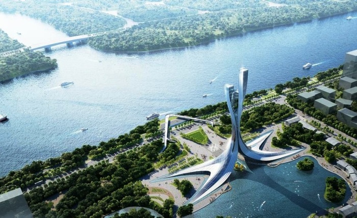 Дизайн памятника Xiangjiang Gate отдает дань географическому положению города, а также его историческому и культурному наследию (концепт RMJM Shanghai). | Фото: archdaily.com.Своеобразное видение ворот между культурой и традициями, устойчивостью и современностью представило отделение британского архбюро RMJM в Шанхае на Международном конкурсе проектов строительства памятника Xiangjiang Gate (Ворот Сянцзян). Власти Хэнъяна решили построить памятник на месте слияния рек Сян, Чжэн и Лишуй поэтому и был объявлен конкурс, в котором принимали участие международные архитектурные студии. Концепт архбюро RMJM настолько поразил устроителей конкурса, что было решено строить Ворота Сянцзян в виде переплетенных высоток, которые символизируют древнюю историю, стихию воды и огня, а также ...гуся.