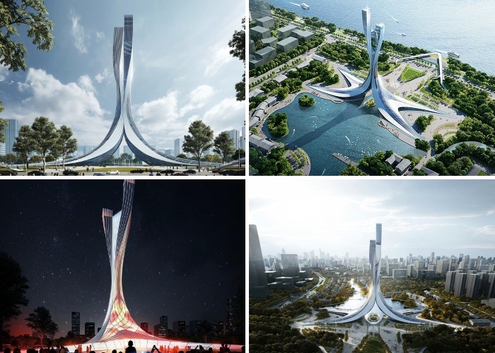 Дизайнерская студия RMJM, автор концепта Лахта-центр в Санкт-Петербурге, создала новый проект, который стал победителем в конкурсе на строительство Врат Сянцзян в Хунани (Китай). Две извилистые башни, переплетенные в центре между собой, поднимутся на высоту 177 м и станут многофункциональным памятником традиционной культуре, истории и современным технологиям. Дизайн памятника Xiangjiang Gate отдает дань географическому положению города, а также его историческому и культурному наследию (концепт RMJM Shanghai). | Фото: archdaily.com.Своеобразное видение ворот между культурой и традициями, устойчивостью и современностью представило отделение британского архбюро RMJM в Шанхае на Международном конкурсе проектов строительства памятника Xiangjiang Gate (Ворот Сянцзян). Власти Хэнъяна решили построить памятник на месте слияния рек Сян, Чжэн и Лишуй поэтому и был объявлен конкурс, в котором принимали участие международные архитектурные студии. Концепт архбюро RMJM настолько поразил устроителей конкурса, что было решено строить Ворота Сянцзян в виде переплетенных высоток, которые символизируют древнюю историю, стихию воды и огня, а также .гуся. Два небоскреба 177 м высоты переплетаются и создают сборный образ символов связанных с городом Хэнъян (Xiangjiang Gate, концепт RMJM Shanghai). | Фото: newatlas.com.Концепция дизайна отражает особые символы, которые глубоко укоренилась в истории этого города. Дизайн объединенных башен возвращает нас к сущности человечества – огню.Интересный факт: Хэнъян – город древней истории, берущей свое начало 5-6 тыс. назад. Именно здесь появились первые поселения людей орудиями труда, которых был камень, а главным оберегом и спасителем – огонь. Этот факт подтверждается записями в классическом китайском тексте «Shan Hai Jing – Great Wild West». В нем говорится, что город был первым населенным пунктом, который стал обладателем знака Чжу Жуна – Бога Огня и Юга.Как дань водной стихии Ворота Сянцзян располагаются в месте соединения двух основных рек города. Сверху центральные башни здания выглядят как узкий поток воды, проходящий сразу через два участка земли. Если повернуть переплетенные небоскребы на 90 градусов, то они будут похожи на летящего гуся (концепт RMJM Shanghai). | Фото: archdaily.com.С гусем связана не менее интересная, и даже интригующая история. В древнекитайской поэзии, дошедшей до наших дней территория Хэнъян (Hangyang) была зимним убежищем для диких гусей, спасавшихся от холодов севера, и по этой причине он и получил прозвище – «Город диких гусей». Также, согласно древним традициям, дикий гусь указывает не только на сезонное изменение температуры, многие верили, что эта птица несет послание любви издалека. И такое почитание отразилось в архитектуре небоскребов, оказывается, если положить здание Xiangjiang Gate на бок, то здание превращается в летящего по небу гуся. Цвет фасада башен будет меняться в зависимости от времен года (Xiangjiang Gate, концепт RMJM Shanghai). | Фото: cladglobal.com.Не забыли дизайнеры RMJM и о культурном наследии региона, которое тесно переплелось с природой. В их проекте фасад памятника будет излучать свет, соответствующий цвета и оттенки времен года. Стеклянная навесная платформа, созданная у подножия небоскребов, будет освещаться в темное время суток с помощью установки специальных светодиодных технологий.Отдавая дань традициям и историческому прошлому, никто не забы
