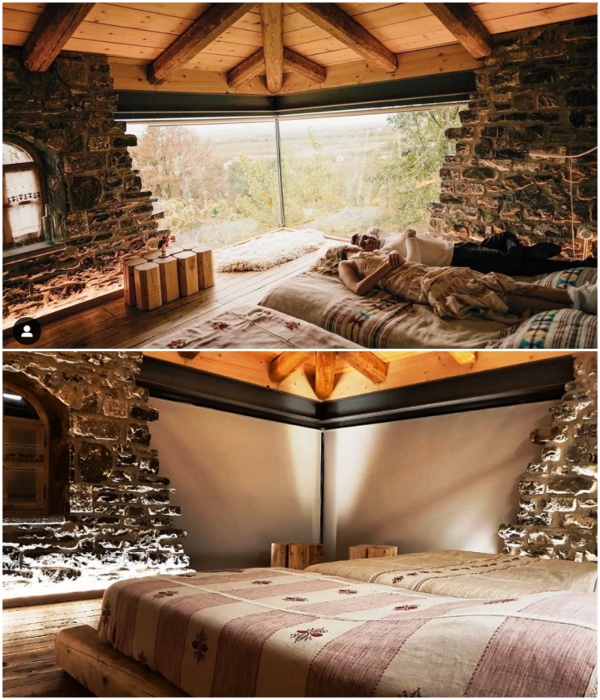 Приватность в номерах со стеклянной стеной создается с помощью плотных рулонных штор (Mrizi i Zanave Agroturizеm, Албания). | Фото: instagram.com/ © mrizi_i_zanave, plisatelier.Два больших номера расположены как раз возле стеклянного угла, так что любоваться сельскими просторами можно будет лежа на кровати. Если же гости пожелают уединиться, то окно можно закрыть с помощью плотных рулонных штор.