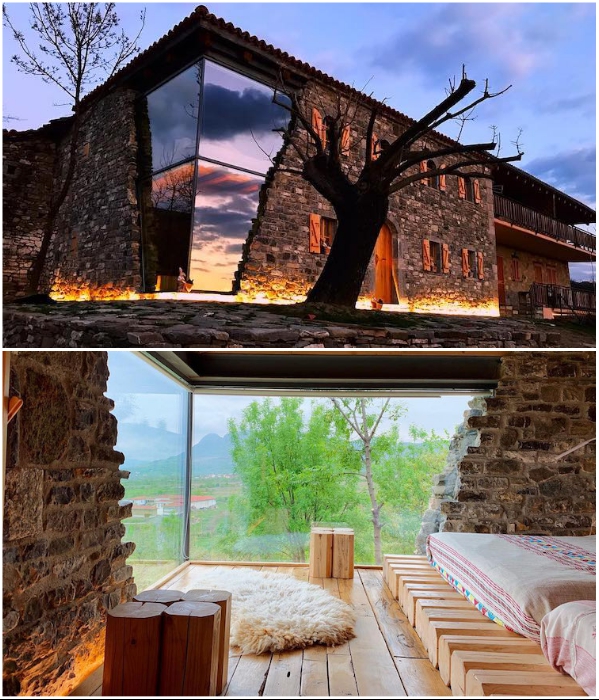 Гости двух номеров могут наслаждаться восхитительным видом, открывающимся за стеклянной стеной (Mrizi i Zanave Agroturizеm, Албания). | Фото: instagram.com/ © mrizi_i_zanave, plisatelier.