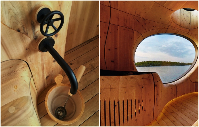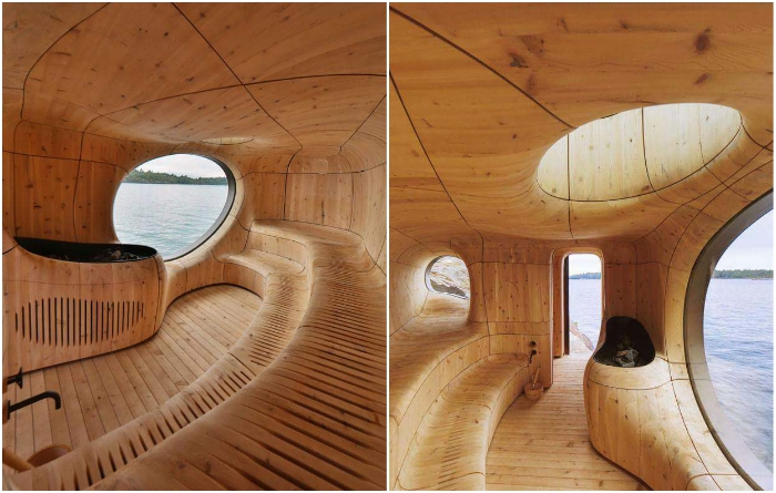 Чтобы придать фасадной древесине прочности без применения химия ее укрепили по технологии Shou Sugi Ban («томление кедра»). partisans.com.Если подходить к сауне со стороны скалистого берега, то взору открывается обычный деревянный короб, созданный из обожженных досок кедра с овальными окнами даже на крыше, но попав внутрь, ни одного угла или ровной линии и не найдешь.