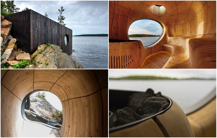 Ничем не приметное снаружи строение появилось на берегу живописного озера San Souci (Канада), знаменитого самыми красивыми закатами на планете. Но интерьер этого объекта под стать живописному месту и стоит лишь переступить его порог, как дух захватывает и от дурманящего запаха кедра, и от дизайна сауны-грота, больше напоминающего скульптурное пространство, нежели столь прозаический объект. На берегу канадского озера San Souci появилась чудо-сауна, интерьер которой больше напоминает скульптурное пространство («Grotto»). hqroom.ru.Как правило, у большинства любителей попариться в сауне во время нахождения внутри парилки дух захватывает от высокой температуры и обжигающего жара, а не от красоты интерьера. Но бывают и исключения, так например, на территории частного острова Санс Сауси (Sans Souci) (канадская сторона озера Гурон), появилось вполне обычное с виду строение с прямым доступом к воде. Оно оказалось сауной, которую спроектировала команда дизайнеров из архбюро Partisans. Часть стены сауны интегрирована в скальную породу берега («Grotto», Канада). nashvancouver.com/ hqroom.ru.Интересный факт от Novate.Ru: Для большинства из нас владелец частного острова кажется богатейшим человеком, как минимум звезда мирового масштаба или какой-нибудь арабский шейх. Но в Канаде (и не только) остров площадью от 5 до 7 га с благоустроенным коттеджем стоит значительно дешевле (!), чем стандартная двушка 40 квадратов в Москве. Все элементы внутреннего убранства вырезаны из древесины местного кедра («Grotto», Канада). roomble.com.Казалось бы, что такого особенного в этом обычном строении кроме расположения, ведь оно находится в том месте, где по версии National Geographic можно наблюдать одни из самых красивых закатов мира. Но переступив порог этого сооружения, все теряют дар речи, ведь попадают действительно в невероятное пространство, которое кроме как скульптурным шедевром по-другому и не назовешь. Чтобы придать фасадной древесине прочности без применения химия ее укрепили по технологии Shou Sugi Ban («томление кедра»). partisans.com.Если подходить к сауне со стороны скалистого берега, то взору открывается обычный деревянный короб, созданный из обожженных досок кедра с овальными окнами даже на крыше, но попав внутрь, ни одного угла или ровной линии и не найдешь. Схема размещения сауны на скалистом берегу («Grotto», Канада). / Фото: theawesomedaily.com.Чтобы добиться такого эффекта дизайн внутреннего пространства пришлось разрабатывать с помощью конструкторских программ и 3D-технологий, ведь ее обтекаемые элементы вырезаны из цельного кедра и сделаны в форме настоящего грота или пещеры. Единственное, что кардинально отличает эти объекты – натуральное теплое дерево вместо холодных камней. Фасадная часть сауны была собрана на заводе и водным путем доставлена на нужное место («Grotto», Канада). / Фото: partisans.com.Учитывая сложность ландшафта и стремление оградить окружающую природу от механических повреждений, каждый элемент интерьера и экстерьера был вырезан на станках с ЧПУ местного деревообрабатывающего завода, там же был сделан и собран короб фасада. Практически в готовом виде сауну, которую создатели назвали «Grotto», доставили по воде и установили на заранее приготовленный бетонный фундамент, чтобы уберечь дерево от попадания влаги. Для утепления сооружения сделали прослойку из воздуха и алюминиевой фольги («Grotto», Канада). / Фо