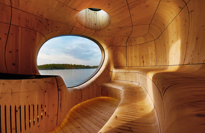 На берегу канадского озера San Souci появилась чудо-сауна, интерьер которой больше напоминает скульптурное пространство («Grotto»). hqroom.ru.Как правило, у большинства любителей попариться в сауне во время нахождения внутри парилки дух захватывает от высокой температуры и обжигающего жара, а не от красоты интерьера. Но бывают и исключения, так например, на территории частного острова Санс Сауси (Sans Souci) (канадская сторона озера Гурон), появилось вполне обычное с виду строение с прямым доступом к воде. Оно оказалось сауной, которую спроектировала команда дизайнеров из архбюро Partisans.