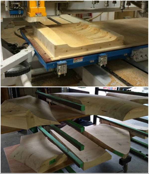 Фасадная часть сауны была собрана на заводе и водным путем доставлена на нужное место («Grotto», Канада). / Фото: partisans.com.Учитывая сложность ландшафта и стремление оградить окружающую природу от механических повреждений, каждый элемент интерьера и экстерьера был вырезан на станках с ЧПУ местного деревообрабатывающего завода, там же был сделан и собран короб фасада. Практически в готовом виде сауну, которую создатели назвали «Grotto», доставили по воде и установили на заранее приготовленный бетонный фундамент, чтобы уберечь дерево от попадания влаги.
