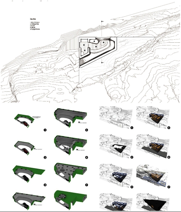 Схема размещения сауны на скалистом берегу («Grotto», Канада). / Фото: theawesomedaily.com.Чтобы добиться такого эффекта дизайн внутреннего пространства пришлось разрабатывать с помощью конструкторских программ и 3D-технологий, ведь ее обтекаемые элементы вырезаны из цельного кедра и сделаны в форме настоящего грота или пещеры. Единственное, что кардинально отличает эти объекты – натуральное теплое дерево вместо холодных камней.