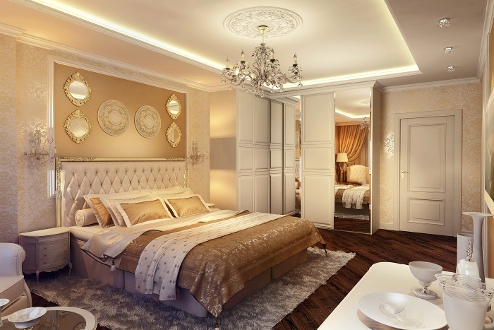 Неоклассический стиль — для ценителей роскоши. /Фото: sakhexpo.ruПоклонники элегантной роскоши оценят дизайн спальни в неоклассическом стиле. Характерные черты: лепнина, колоны, арки, четкие линии, бордюры. В качестве декора используются дорогие материалы: гранит, мрамор, натуральное дерево, кожа. Цветовая гамма настенных и потолочных покрытий — нейтральные пастельные оттенки. Такой стиль подойдет для спальни большой площади с высокими потолками.