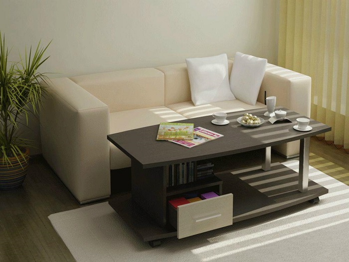 Журнальный столик нельзя ставить вплотную к дивану. / Фото: Sofme.ruПравильная расстановка мебели – это еще один важный «кит», на котором стоит комфорт будущей квартиры. Очень важно оставлять широкие проходы между предметами, чтобы было место для маневров. Например, на кухне между гарнитуром и островом должно быть не менее 100-120 сантиметров. То же самое касается и гостиной – если вы захотите купить журнальный столик (хотя это далеко не самое лучшее решение для крохотной комнаты), не нужно ставить его вплотную к дивану, ведь в этом случае вам постоянно нужно будет отодвигать его, чтобы присесть. Лучше всего приобрести небольшой кофейный столик и расположить его не напротив, а сбоку. Таким решением вы убьете сразу двух зайцев: сохраните главные функции мебели (вам будет куда положить журнал или поставить чашку с кофе), и при этом освободите путь к дивану.
