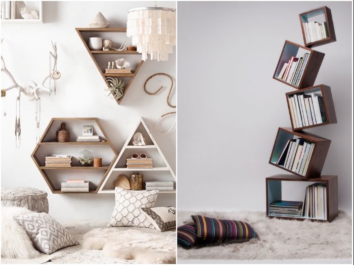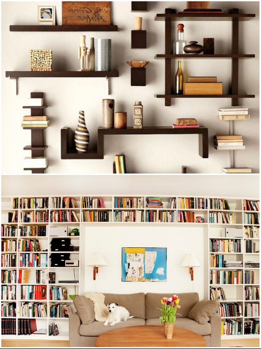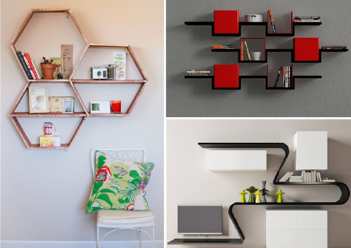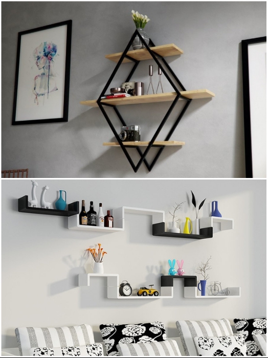 Необычные формы открытых полок сами по себе могут стать украшением комнаты. | Фото: kvartira.mirtesen.ru.Если хотите сделать акцент именно на этом предмете интерьера, тогда следует выбирать дизайнерские модели и необязательно покупать их за баснословные деньги, достаточно модернизировать имеющиеся в наличии полки. Для этого порой достаточно будет покрасить заднюю стенку или сам каркас в контрастный/яркий цвет.