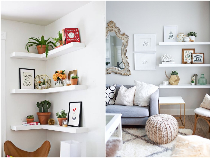 Парящие полки помогут заполнить каждый угол даже небольшого пространства и при этом не будут перегружать интерьер. | Фото: novamett.ru/ weareart.ru.Главное преимущество небольших открытых полок состоит в их незаменимой способности разгружать пространство. И что особенно важно, они действительно помогают в оформлении интерьера маленьких комнат или квартир-студий. Для небольших пространств дизайнеры советуют использовать парящие полки в тон стен, с их помощью можно создать акцент с особенной изюминкой или наоборот могут их сделать практически незаметными.