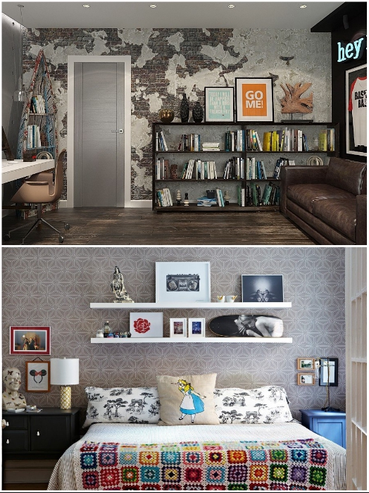 Даже самые неожиданные вещи и материалы могут стать изюминкой интерьера. | Фото: kvartira.mirtesen.ru/ интерьерклуб.рф.Совет от Novate.Ru: Если решите для этих целей купить или сделать собственноручно полку, то лучше отдавать предпочтение необычным формам и интересным материалам — вариантов масса, но не стоит забывать о том, что любой объект должен органично вписаться в дизайн.4. Возможность комбинировать разные модули и делать необычные композиции