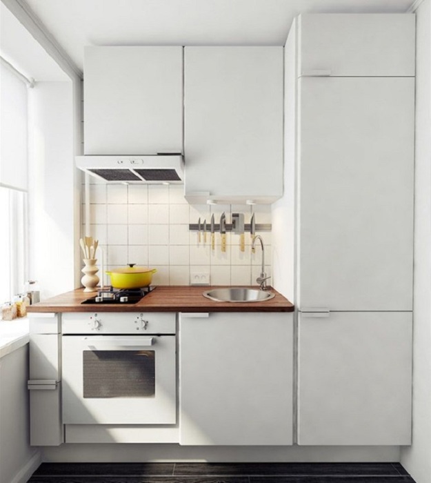 Мебель, сделанная на заказ - идеальный вариант. / Фото: Adcitymag.ruУчитывая тот факт, что на такой крохотной кухне каждый сантиметр на вес золота, вариант с покупкой готового углового гарнитура в обычном мебельном магазине не подходит. Лучше всего составить индивидуальный проект, в котором будут учитываться все ваши пожелания, а также площадь и особенности кухни. Вы сможете не только предусмотреть нишу для микроволновой печи, место для вытяжки, но также самостоятельно подобрать материал и фурнитуру будущей мебели. Существенным минусом является только стоимость – она будет в несколько раз выше, чем при покупке готового гарнитура. Однако помните, что вы в первую очередь платите за свое удобство и комфорт. К тому же, кухня оформляется ни на один год, поэтому в ваших же интересах, чтобы она соответствовала абсолютно всем требованиям.