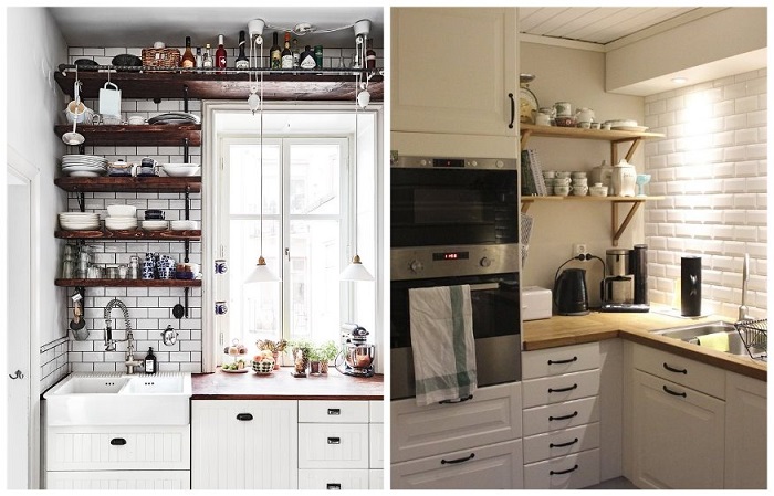 Открытые полки экономят площадьОткрытые полки постоянно вызывают споры: кто-то говорит, что они непрактичные, так как собирают пыль, а кто-то рассматривает их в качестве идеальных систем хранения на маленькой площади. Наше мнение таково: если у вас просторная кухня, вы можете смело отказаться от идеи открытых полок и заменить их традиционными шкафчиками со стеклянными дверцами. Если же комната имеет площадь 4 кв. м., то полки становятся настоящим спасением – они выглядят легче, не занимают много места, добавляют уюта в помещение, и в разы сокращают поиск нужной посуды или специй.Вытирать их каждый день не нужно. Достаточно пары раз в неделю, особенно в том случае, если полки находятся далеко от плиты. Задачу облегчит специальная метелка для пыли – она устранит все загрязнения в считанные секунды. Однако обязательно следует обращать внимание на то, что на открытой полке всегда должен быть порядок. Расставляйте на них красивую яркую посуду либо однотипные емкости для хранения – банки, ящики или контейнеры.
