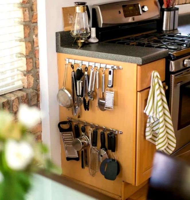 Повесьте крючки на наружной стенке шкафчика. / Фото: Web.archive.orgШкафчики – это далеко не единственное место, где можно хранить продукты и кухонные принадлежности. Можно задействовать:• пространство над входной дверью (в старых домах там обычно есть ниша);• место под подоконником;• внутреннюю сторону дверцы шкафа – там можно повесить крючки для различных кухонных аксессуаров;• площадь под раковиной – мусорное ведро является не единственным предметом, которое можно расположить под мойкой. Поставьте там несколько корзин для бытовой химии и прочих средств для уборки, мытья посуды;