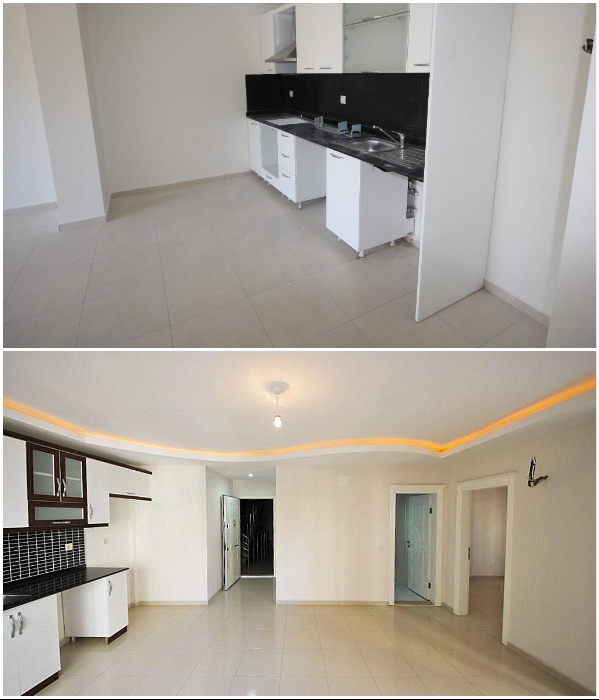 В таком виде квартиры продаются в новострое «под ключ» (Аланья, Турция). | Фото: amestate.com.ua.Турция - та страна, где на законодательном уровне покупатель/инвестор полностью защищен от недобросовестных застройщиков, и по этой причине строители выполняют свои обещания в полной мере. По крайней мере, это касается индивидуальных квартир. Даже самое бюджетное жилье сдается полностью в чистовой отделке с обязательной установкой оконных рам, межкомнатных дверей, металлических входных дверей, с полным комплектом сантехники и даже со встроенными кухнями. Иногда застройщики продают полностью меблированные апартаменты с комплектом необходимой бытовой техники.