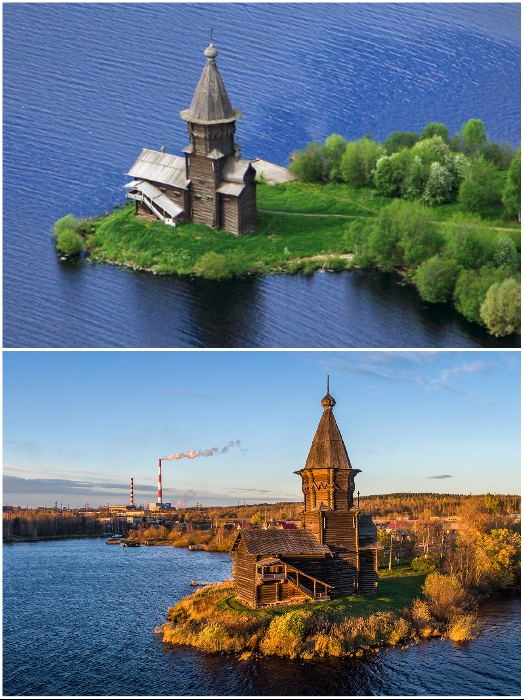 Успенская церковь 4 раза перестраивалась и такой вид имела, начиная с 1774 г. (Кондопог, Карелия). | Фото: flashnord.com/ klin-demianovo.ru.Уникальный памятник русского деревянного зодчества, Успенская церковь в городке Кондопоге первый раз была срублена еще в XVI в. На протяжении трех столетий она перестраивалась, за это время прихожане собрали средства еще и на создание Шатровой колокольни и церкви Рождества Богородицы.