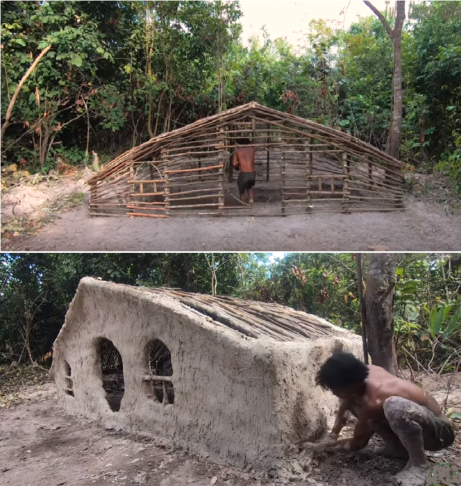 Камбоджийцы знают, какую глину можно использовать, чтобы она не растворялась и не осыпалась в воде. | Фото: youtube.com/ © Primitive Unique Tool.Используя ветки деревьев, стволы бамбука, глину и солому, камбоджийский мастер сделал каркас и стены. После полного высыхания своеобразной отделки ему пришлось таскать воду глиняным сосудом, чтобы наполнить бассейн, но результат того стоил. Такими действиями он в очередной раз доказал, что, если руки растут откуда надо и есть мыслящая голова, можно создать жилье на подобии виллы и наслаждаться жизнью даже в джунглях.