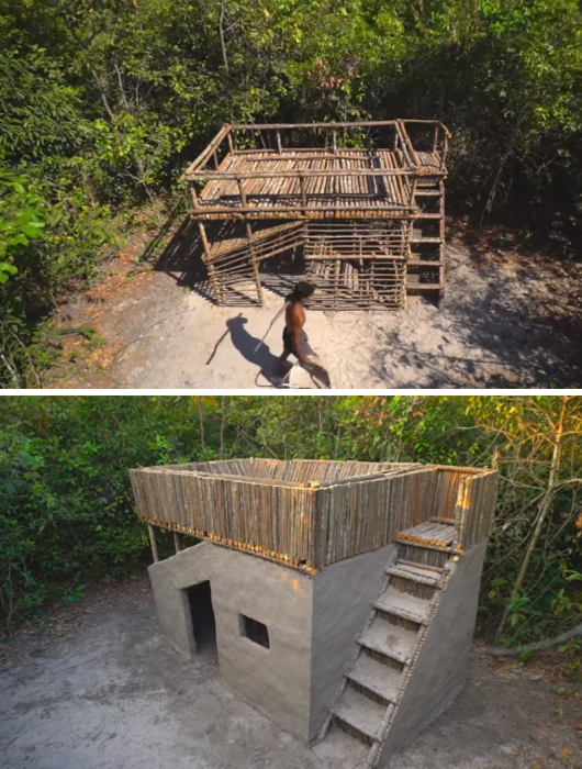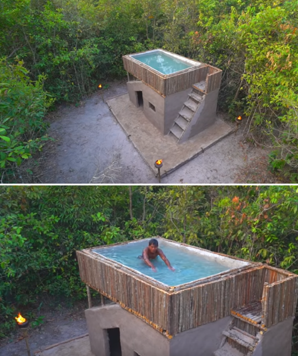 7. Современный дом с бассейном на крыше С помощью подручных материалов и простейшего инструмента молодой человек построил каркас будущего дома. | Фото: youtube.com/ © Primitive Unique Tool.Не только примитивные или земляные хижины могут построить камбоджийские умельцы собственноручно и практически без инструментов. Молодой человек построил довольно приличный домик со стандартной высотой потолков, а вместо ванной комнаты создал настоящий бассейн на его крыше.