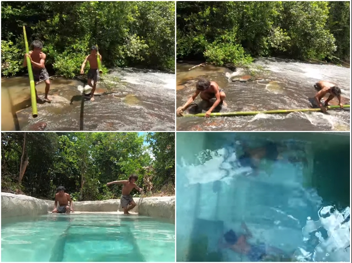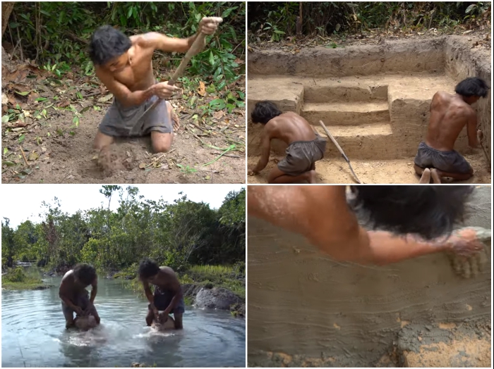 Для большинства из нас создание обычного подвала на дачном участке - огромная проблема, и это при наличии современного инструмента и материалов. Но находятся умельцы, которые умудряются создавать поистине удивительные подземные (и не только) объекты, имея под рукой лишь природный стройматериал, деревянные палки с металлическим наконечником, свои руки и невероятную фантазию.1. Бассейн с подводными кроватями Процесс создания ямы под бассейн и облицовка его дна с помощью ила из озера. | Фото: youtube.com/ © Jungle Survival.Такая идея создания бассейна мало кому пригодится в полном объеме, ведь кровать под водой – настоящий абсурд, если ты не человек-амфибия. Но посмотреть на людей, которые настолько увлечены созданием фантастических объектов, всегда приятно. Тем более, что идею создания бассейна позаимствовать можно для дачного участка, только в качестве инструмента можно использовать более привычную лопату, а вместо ила из озера – цементный раствор. После высыхания своеобразного раствора бассейн заполнили водой и даже немного отдохнули на «кроватях». | Фото: youtube.com/ © Jungle Survival.Также для заполнения водой не понадобится искать (да и негде!) полые бамбуковые стволы, чтобы протянуть импровизированный водопровод.Интересный факт от Novate.Ru: Бамбук – это трава, достигающая 40-метровой высоты и диаметра полых стволов 30 см. Он довольно широко используется на Востоке, из бамбука с давних времен строят дома, дворцы и даже мосты, также широко применяется его ствол для создания мебели, домашней утвари, водопроводных труб, различных плотов и лодок. До сих пор из стволов бамбука делают оригинальные музыкальные инструменты, зонты, трости, веера, игрушки и многое другое.2. Крутой подземный бассейн с лежаками Подземный бассейн выкопали примитивным инструментом. | Фото: youtube.com/ © Jungle Builder.Камбоджийские ребята настолько мастерски владеют примитивным ручным инструментом, что могут внедрять в жизнь самые фантастические идеи. Так, например, им удалось создать подземный бассейн с организованной зоной отдыха. Казалось, зачем прятать лежаки под землю, ведь вокруг прекрасные девственные леса, но творцам этого шедевра наверное так лучше и безопасней. Для укрепления стен использовали ил, для покраски – природный краситель, а вот воду пришлось таскать кувшинами. | Фото: youtube.com/ © Jungle Builder.Используя все тот же инструмент, двум молодым ребятам удалось создать настоящую земляную пещеру, которую заполнили водой так, чтобы лежаки были над ней. Для того чтобы сделать пребывание под землей более запоминающимся, стены покрасили в синий цвет, добыв его так, как это делали древние люди. Ребята нашли нужное растение и извлекли из его листьев сок с помощью ступы, сделанной из куска полой ветки бамбука и более твердой палки вместо песта. 3. Подземный «особняк» с туннелем и бассейном Камбоджийский парень доказал, что, используя древний метод строительства можно собственноручно сделать дом с бассейном. | Фото: youtube.com/ © Jungle Survival.Глядя на этого парня, который в одиночку сделал подземный дворец, сложно не восхититься талантом и сноровкой. Используя древние знания, он самостоятельно вырубил в земле туннель с настоящими резными сводами, в одной из ниш которого обустроил камеру с земляным лежаком. Изумрудная вода и прохладный дом, что еще надо для комфортной жизни в джунглях. | Фото: youtube.com/ © Jungl