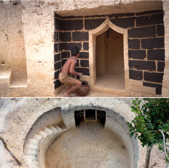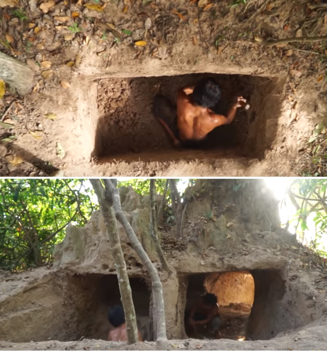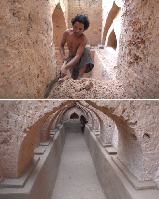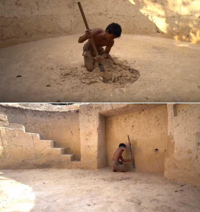 3. Подземный «особняк» с туннелем и бассейном Камбоджийский парень доказал, что, используя древний метод строительства можно собственноручно сделать дом с бассейном. | Фото: youtube.com/ © Jungle Survival.Глядя на этого парня, который в одиночку сделал подземный дворец, сложно не восхититься талантом и сноровкой. Используя древние знания, он самостоятельно вырубил в земле туннель с настоящими резными сводами, в одной из ниш которого обустроил камеру с земляным лежаком.