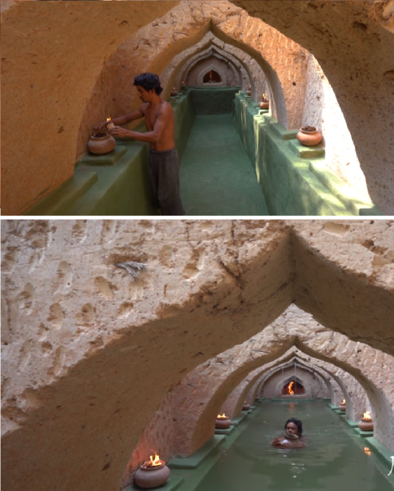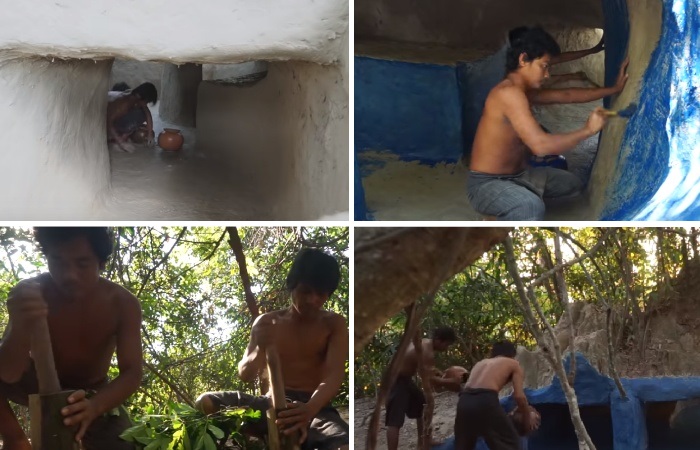 Для укрепления стен использовали ил, для покраски – природный краситель, а вот воду пришлось таскать кувшинами. | Фото: youtube.com/ © Jungle Builder.Используя все тот же инструмент, двум молодым ребятам удалось создать настоящую земляную пещеру, которую заполнили водой так, чтобы лежаки были над ней. Для того чтобы сделать пребывание под землей более запоминающимся, стены покрасили в синий цвет, добыв его так, как это делали древние люди. Ребята нашли нужное растение и извлекли из его листьев сок с помощью ступы, сделанной из куска полой ветки бамбука и более твердой палки вместо песта.