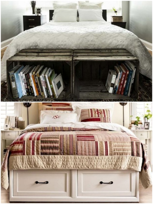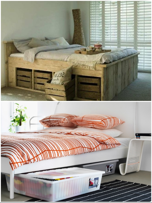 Под кровать можно пристроить все что есть, только не стоит забывать о стиле оформления комнаты. | Фото: pinterest.co.uk/ remont-samomy.ru.Если нет вдохновения или возможности смастерить ящики самостоятельно, то можно подобрать выдвижные детали из старой мебели или пристроить несколько контейнеров/коробок. Особого колорита интерьера придадут плетенные корзины, но их желательно подбирать одного размера и фактуры, чтобы не было разнобоя.