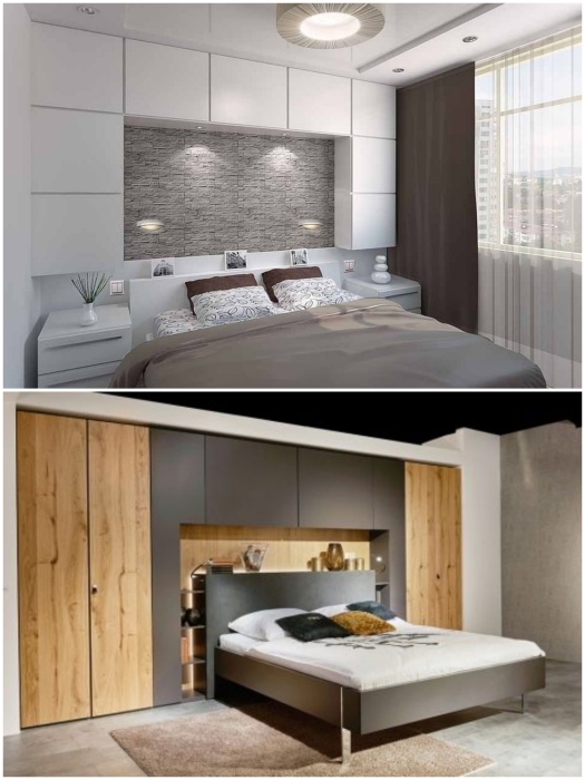 Прикроватное пространство можно задействовать по полной. | Фото: dekoriko.ru/ archidea.com.ua.Не стоит лишь увлекаться и делать их глубокими, они не должны нависать над головой и угнетать отдыхающих, а также лучше отказать от встроенных гипсокартонных массивных конструкций. Мало того, что это уже не модно, так и смотрится они довольно грубо.