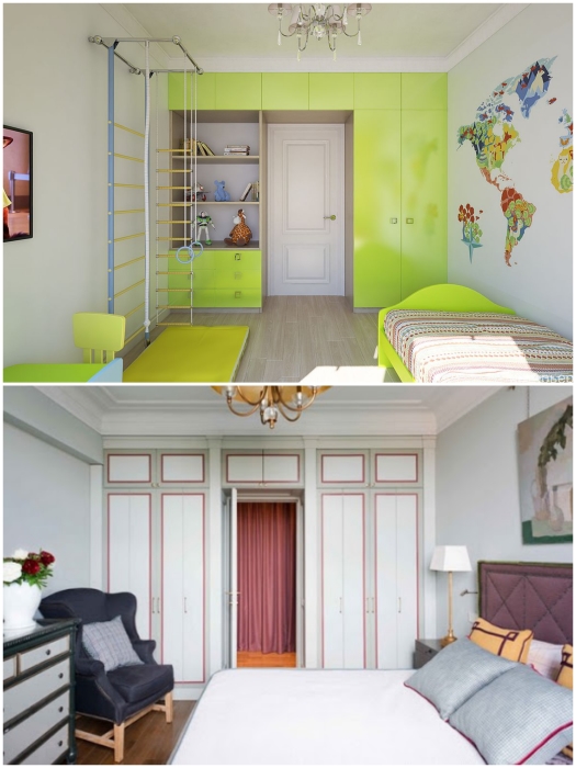 Шкафы вокруг двери могут стать и дополнительным украшением спальни или детской. | Фото: infomebli.ru/ pinterest.com.Идеальный способ пристроить вместительные системы хранения, чтобы они никому не мешали, сделать их вокруг двери. Такой способ расстановки мебельных модулей позволит избежать загромождения площади по периметру. Как правило впритык к дверям кровати или столы не ставят, а вот шкафы там точно никому не помешают.