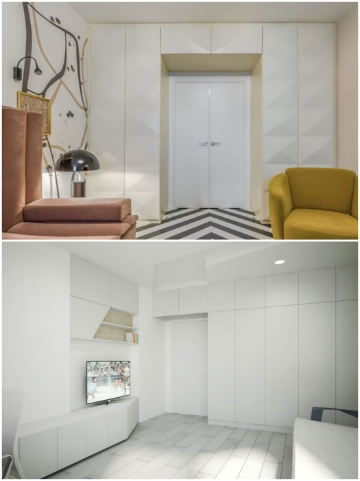 Шкафы вокруг дверного проема лучше выбирать в одном тоне с цветом стен или сделать на них ненавязчивый акцент. | Фото: bezkovrov.com/ pinterest.pt.Если же подобрать одинаковую цветовую гамму с тоном прилегающих стен и сделать их до потолка, то этот мебельный массив никто даже не заметит. Такое расположение лучше всего подойдет для обустройства узких длинных комнат, которые не планируют разделять на зоны.