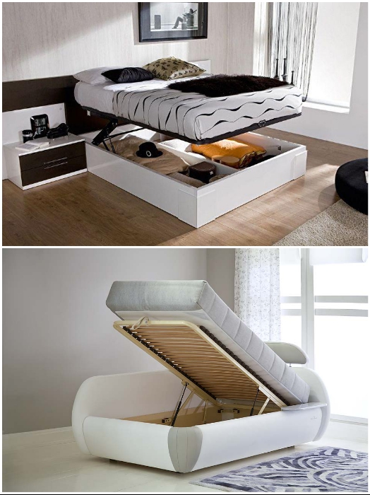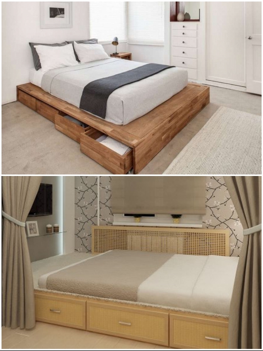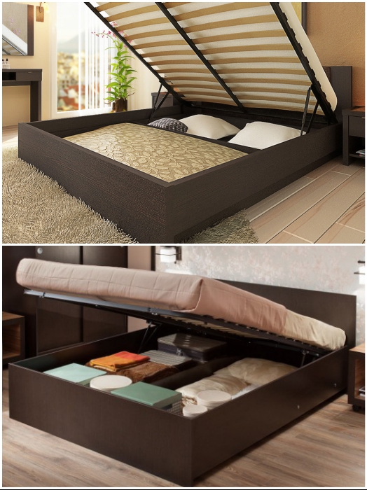 Несмотря на то, что основная функция спальни заключается в обеспечении здорового отдыха и сна, но это вовсе не значит, что ее используют только по назначению. В малогабаритных квартирах спальня – это всегда многофункциональная зона, и от того, как организованы системы хранения, напрямую зависит и порядок, и умиротворяющая атмосфера. И даже если комната совсем мала и не найдется место для установки большого и вместительного шкафа, то несколько скрытых местечек все равно удастся организовать.1. Кровать с подъемным механизмом В кровати с подъемным механизмом можно хранить и постельные принадлежности, и сезонные вещи. | Фото: forum.sdelaimebel.ru/ berloga-mebel.ru.Начнем с самого традиционного способа надежно спрятать крупногабаритные вещи в спальне – с помощью кровати с подъемным механизмом. Это очень удобная и практичная функция такого масштабного предмета мебели, ведь именно он занимает львиную долю пространства в небольшой комнате. Если планируете обустраивать спальню на данный момент, то лучше отдавать предпочтение таким моделям. Да, по цене они будут чуть дороже чем стандартные модели, но потом, когда придет время спрятать зимний вариант одеял или сезонные вещи, то оцените преимущества кровати с большим вместительным ящиком, спрятанным под матрасом. Благодаря разнообразию моделей можно выбрать самую подходящую именно для вас. | Фото: houser.su/ stroy-podskazka.ru.Важно: Если в доме есть мужчина, который владеет инструментом, то запросто можно сделать такую кровать и самому. А способ создания всегда можно найти в интернете.2. Подкроватные ящики Подкроватные ящики всегда помогут спрятать вещи в спальне. | Фото: mebelnuy.com.ua/ planimetria.com.ua.Если замена мебели не входит в ваши планы и приходится довольствоваться тем что есть, то можно найти выход из положения самостоятельно. Обладателям кровати на ножках ничего сверхъестественного придумывать не надо, достаточно будет сделать ящики, которые поместятся под кровать. Подкроватные ящики, впрочем, как и саму кровать можно сделать самостоятельно. | Фото: novamett.ru/ matrason.ua. Под кровать можно пристроить все что есть, только не стоит забывать о стиле оформления комнаты. | Фото: pinterest.co.uk/ remont-samomy.ru.Если нет вдохновения или возможности смастерить ящики самостоятельно, то можно подобрать выдвижные детали из старой мебели или пристроить несколько контейнеров/коробок. Особого колорита интерьера придадут плетенные корзины, но их желательно подбирать одного размера и фактуры, чтобы не было разнобоя. 3. Спальное место на подиуме Функциональность кровати возрастает если ее поместить на подиум. | Фото: Stroy-podskazka.ru/ pinterest.com.Если в комнате катастрофически не хватает места и для кровати, и для шкафа, то можно совместить приятное с полезным. Для этого нужно поднять кровать на подиум, и чем выше он будет, тем больше вещей получится спрятать. Единственное, о чем предупреждают авторы Novate.Ru, не сильно увлекайтесь высотой мало того, что это может не очень красиво выглядеть, так и спать под потолком не очень-то комфортно. Если есть возможность устроить спальное место на втором ярусе, то площади для передвижения и хранения значительно прибавится. | Фото: pinterest.com/ kvartblog.ru.Исключения составляют вторые ярусы, когда высота позволяет и нужно освободить напольное пространство. Как правило, такие площадки делают самостоятельно или приглашают мастера, поэт